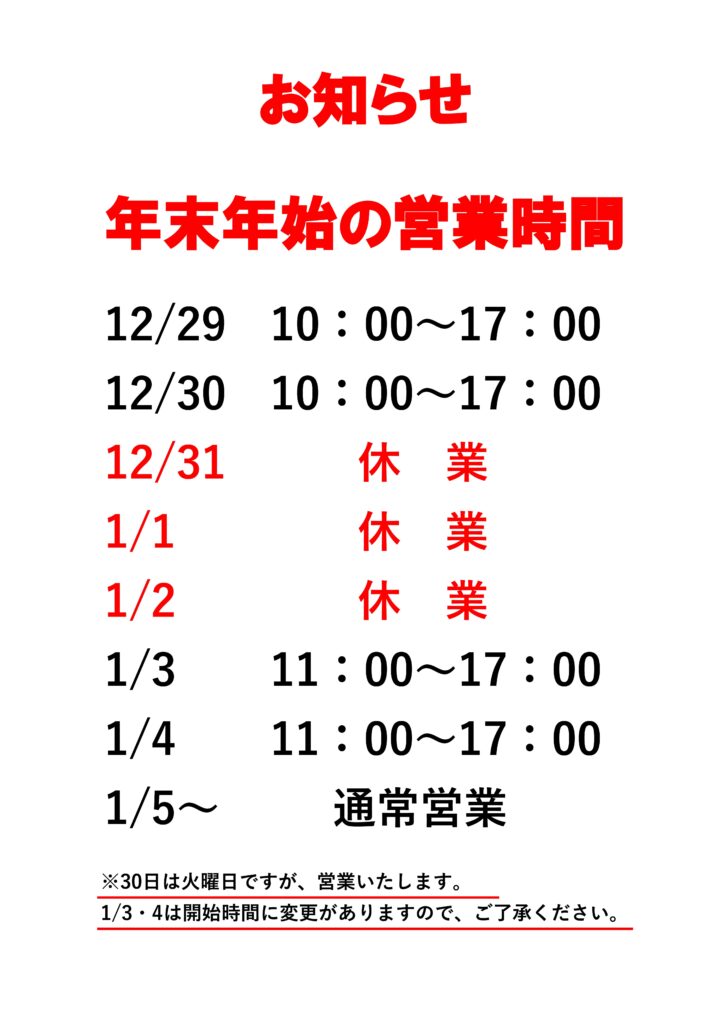 年末年始は下記の通り、営業時間を変更させていただきます。